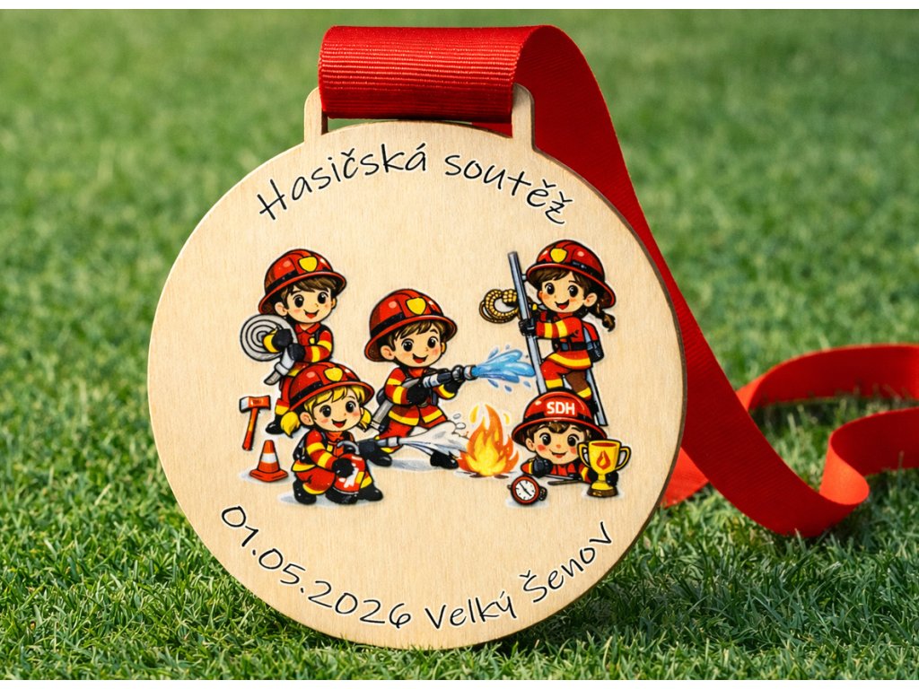 Kvalitní dřevěné medaile s kompletní personalizací pro hasiče - vzpomínkový předmět na hasičskou soutěž, hasičský oddíl nebo den s hasiči. Každou medaili personalizujeme jménem dítěte, datem či jiným textem podle vašeho přání.