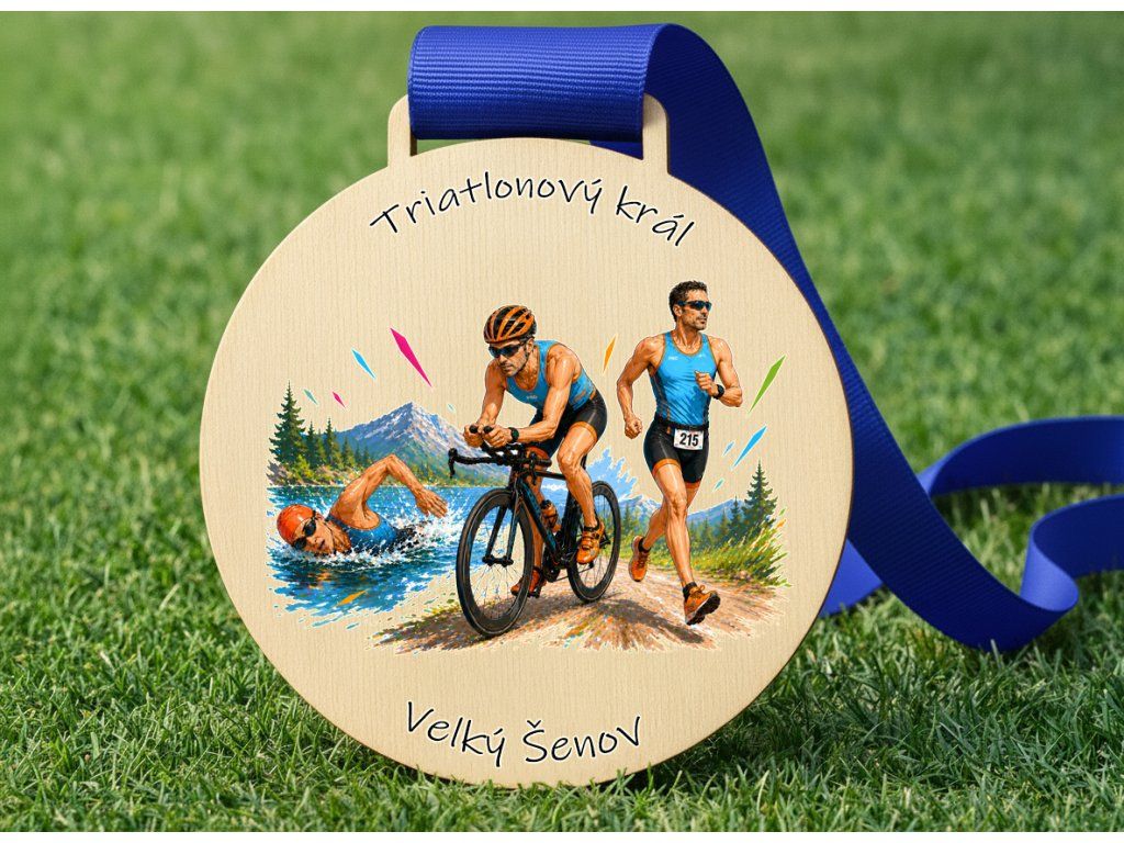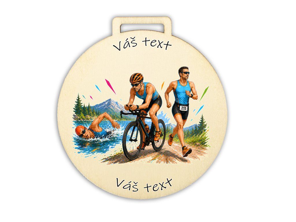 Kvalitné drevené medaily s kompletnou personalizáciou - spomienkový predmet na triatlonové preteky. Každú medailu personalizujeme menom bežca, dátumom či iným textom podľa vášho želania.